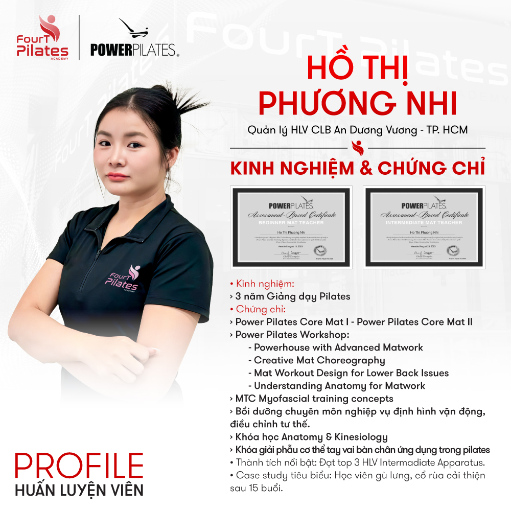 Với 3 năm kinh nghiệm tập luyện và giảng dạy Pilates chuyên sâu, HLV Hồ Thị Phương Nhi hiện đang đảm nhiệm vai trò Supervisor, chuyên huấn luyện cá nhân hóa 1:1 và quản lý chất lượng chuyên môn để mang lại kết quả tối ưu nhất cho học viên.