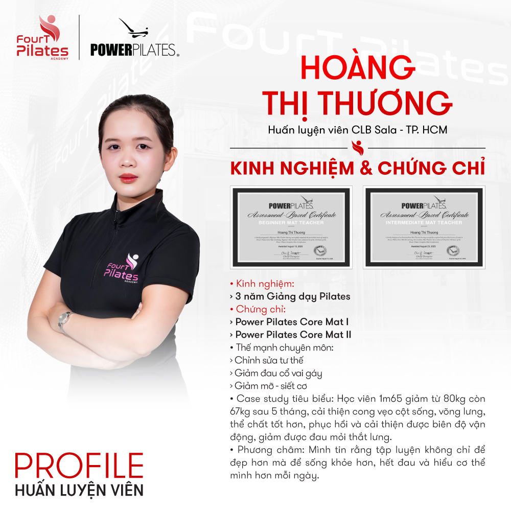 Với 3 năm kinh nghiệm giảng dạy, HLV Hoàng Thị Thương chuyên huấn luyện cá nhân hóa 1:1, kết hợp các bài tập chuẩn hệ thống Power Pilates để giúp học viên giải quyết các vấn đề về vóc dáng và bệnh lý cột sống, mang lại sự thay đổi tích cực về cả thể chất lẫn tinh thần.
