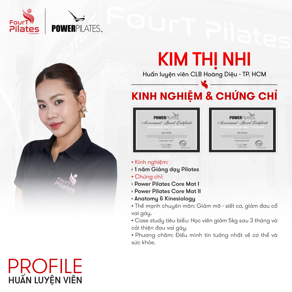 Với nền tảng kiến thức bài bản về giải phẫu và hệ thống Power Pilates quốc tế, HLV Kim Thị Nhi chuyên huấn luyện cá nhân hóa 1:1, giúp học viên tối ưu hóa vóc dáng và giải tỏa các áp lực lên vùng cổ vai gáy một cách an toàn, hiệu quả.