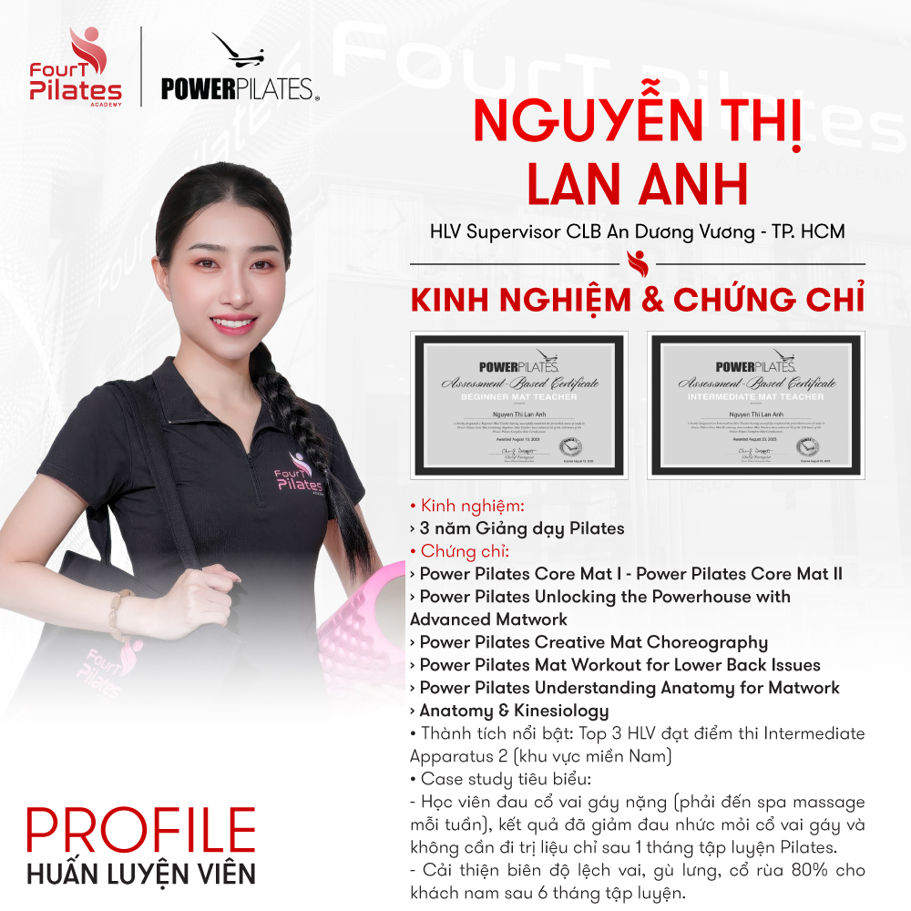 Với 3 năm kinh nghiệm giảng dạy chuyên sâu, HLV Nguyễn Thị Lan Anh đảm nhiệm vai trò Supervisor, chuyên huấn luyện cá nhân hóa 1:1. Chị kết hợp kỹ thuật Pilates chuẩn quốc tế với tư duy vận động hiện đại để giúp học viên giải quyết các vấn đề bệnh lý và tối ưu hóa hình thể.