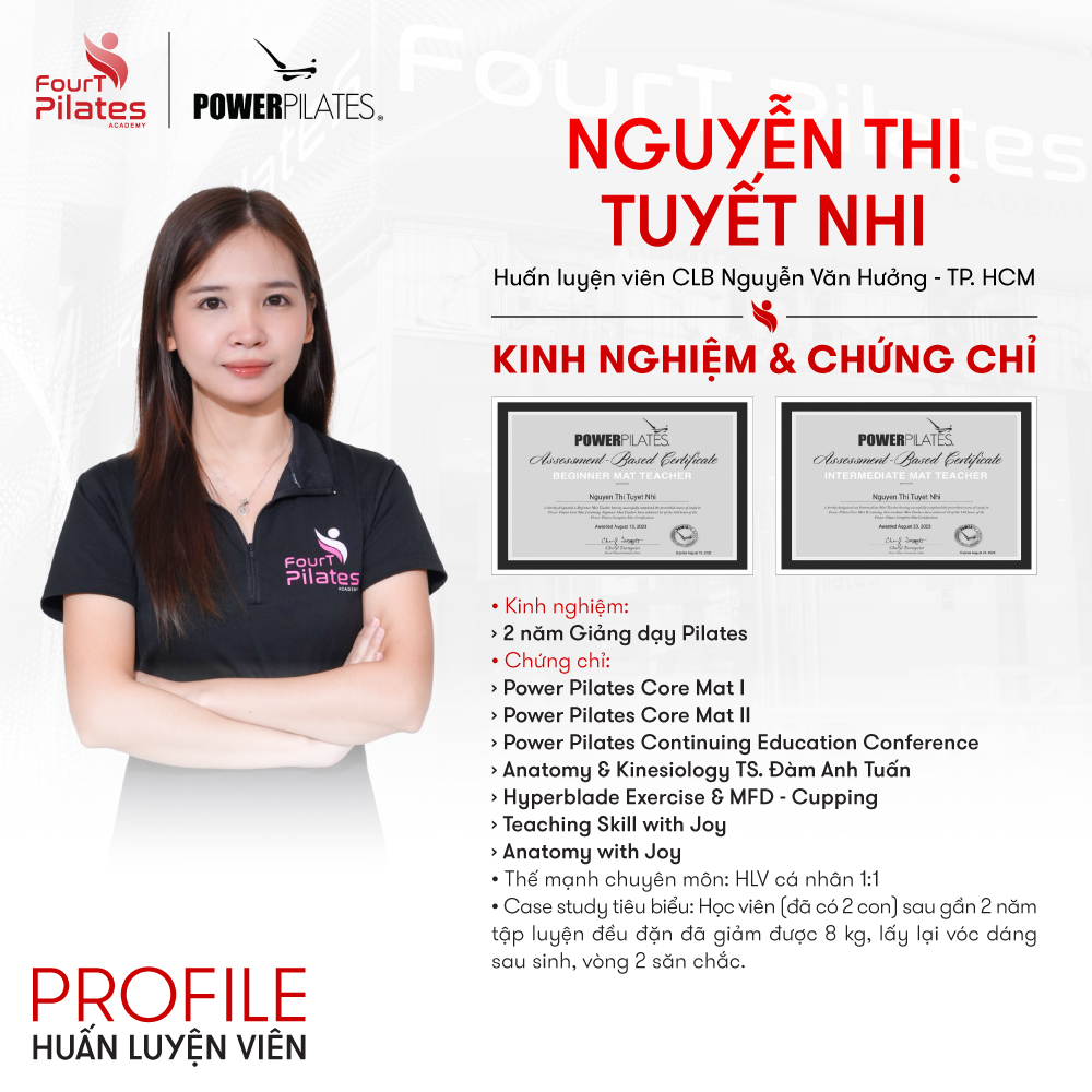Với 2 năm kinh nghiệm Pilates, HLV Nguyễn Thị Tuyết Nhi chuyên huấn luyện cá nhân hóa 1:1, kết hợp kiến thức chuyên sâu về giải phẫu và vận động học để giúp học viên cải thiện sức khỏe, phục hồi vóc dáng và xây dựng lối sống lành mạnh.