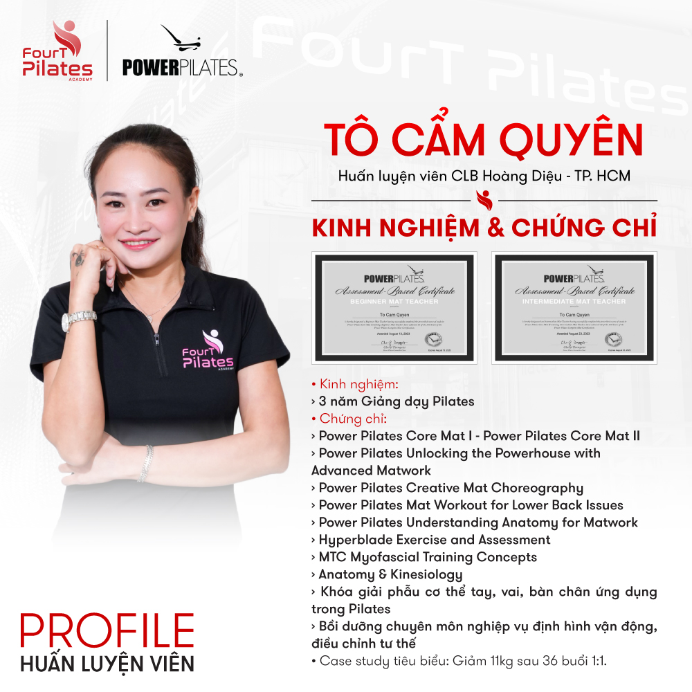 Với 3 năm kinh nghiệm Pilates, HLV Tô Cẩm Quyên chuyên huấn luyện cá nhân hóa 1:1, giúp học viên cải thiện sức khỏe, chỉnh sửa tư thế, giảm đau cổ vai gáy – đau lưng và định hình vóc dáng hiệu quả.