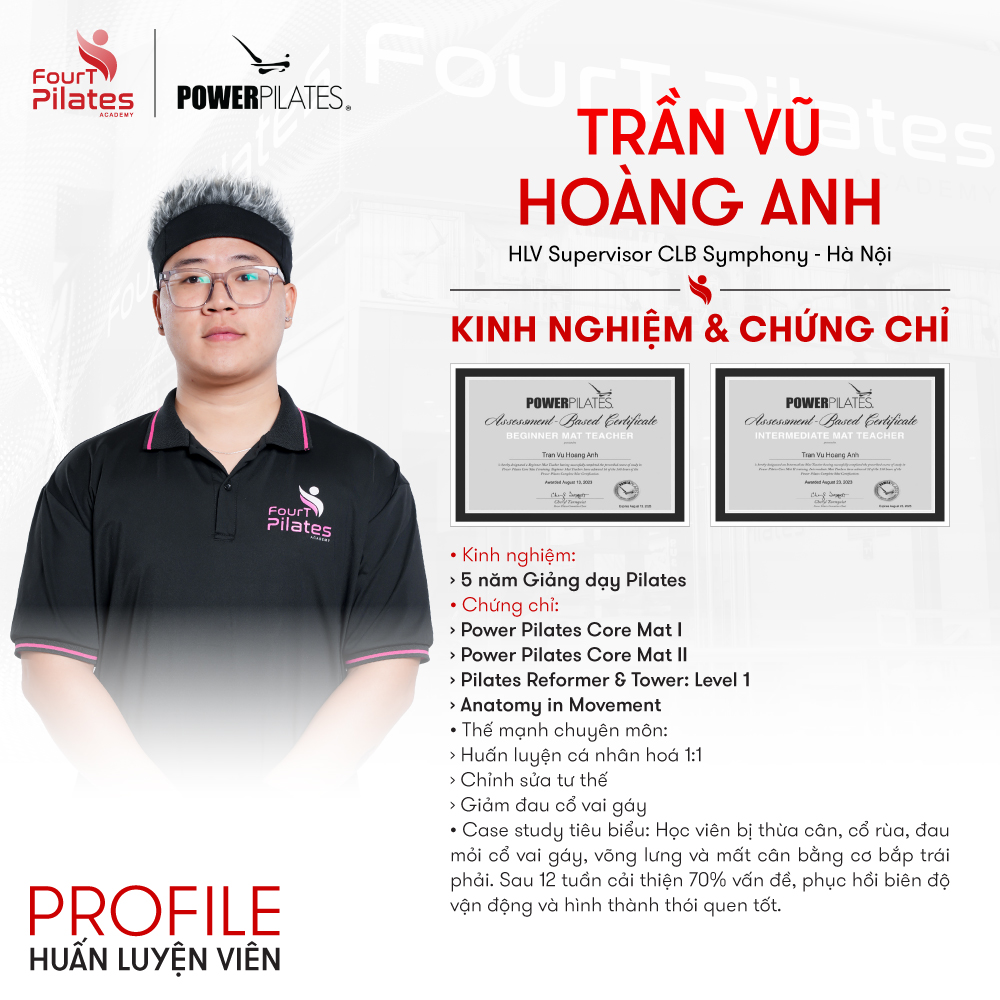 Với 5 năm kinh nghiệm chuyên sâu trong ngành vận động và Pilates, HLV Trần Vũ Hoàng Anh hiện đảm nhiệm vai trò Supervisor. Anh chuyên thiết kế các chương trình huấn luyện cá nhân hóa 1:1, kết hợp giữa kỹ thuật kiểm soát cơ thể và kiến thức giải phẫu chuyển động để mang lại kết quả tối ưu và bền vững cho học viên.